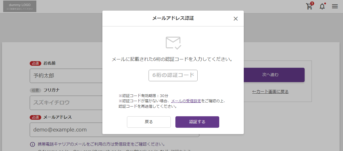 メールアドレス認証とは、お客様情報で入力したメールアドレスを、注文者が受信可能であることを確認するための仕組みです。